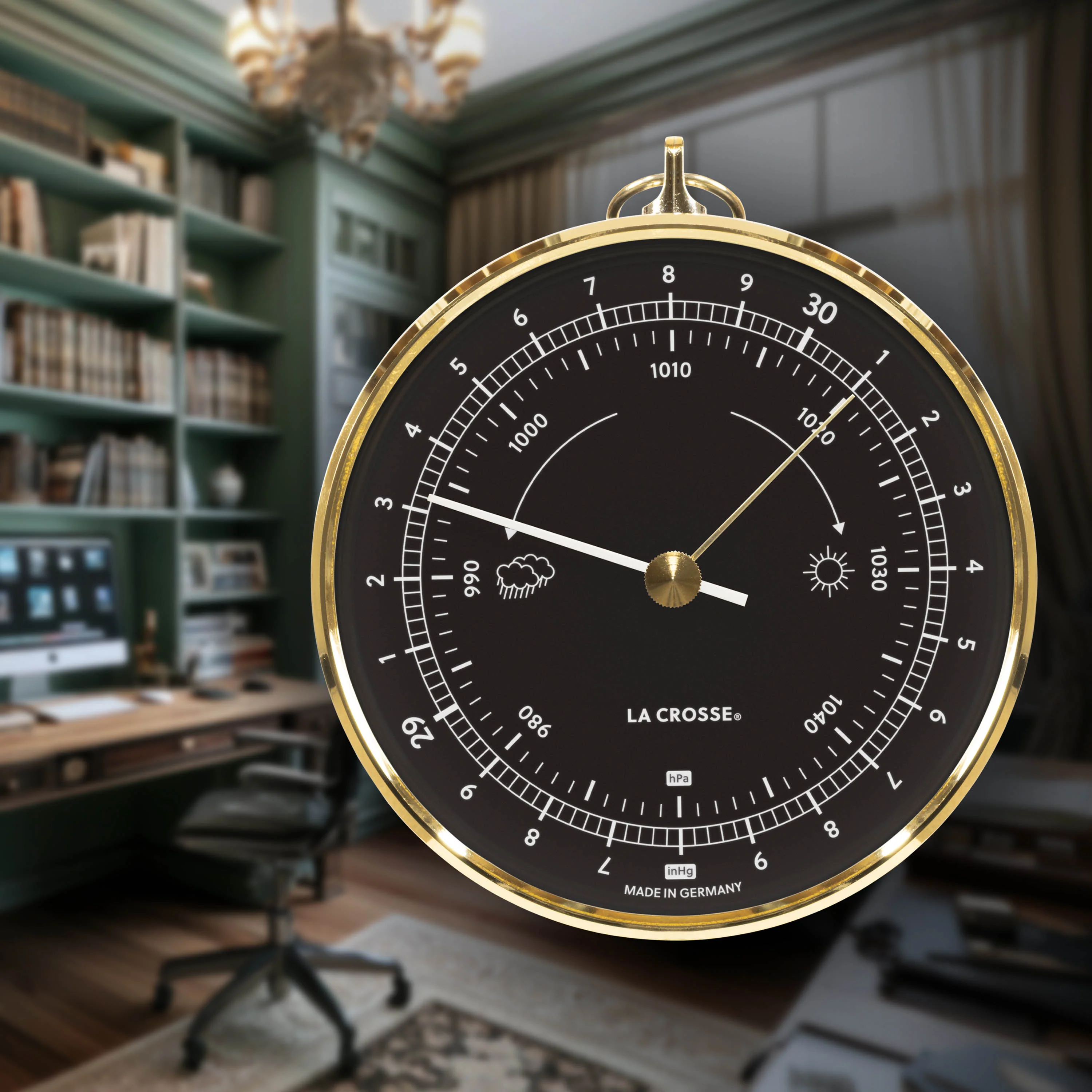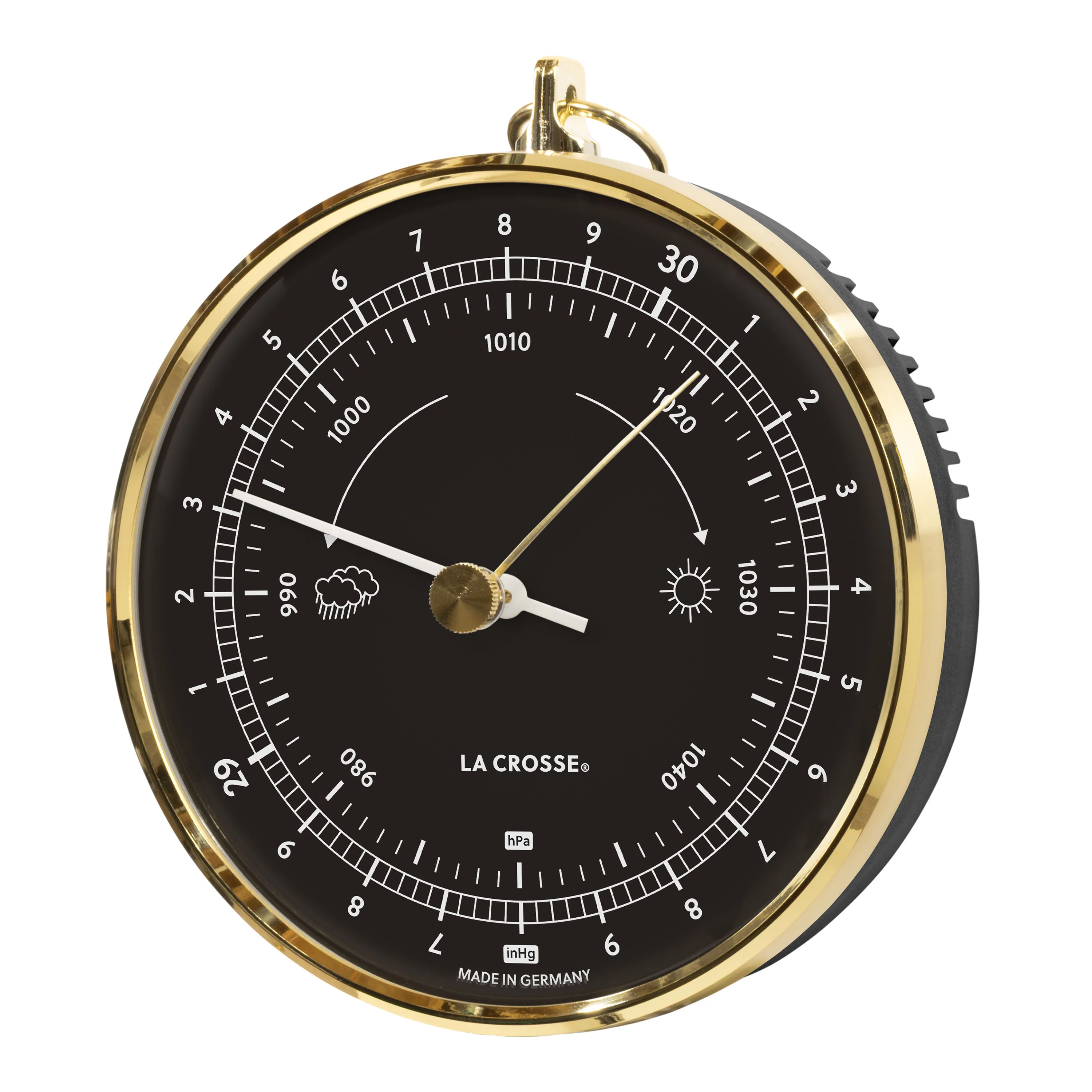 Analog weather readings that get down to brass tactics. The 138-611B Analog Dial Barometer tracks atmospheric pressure on a compact 4-inch dial with dual scales—inches of mercury and hectopascals—so you can read changing conditions before they arrive. The brass slimline frame and white metal pointer give it a striking contrast against the UV-protected black dial that belongs on any wall. Durable construction and a domed protective glass lens mean it's built to hold up wherever you hang it. No batteries, no Wi-Fi, no waiting on a forecast—just brass, glass, and your own read on the weather.