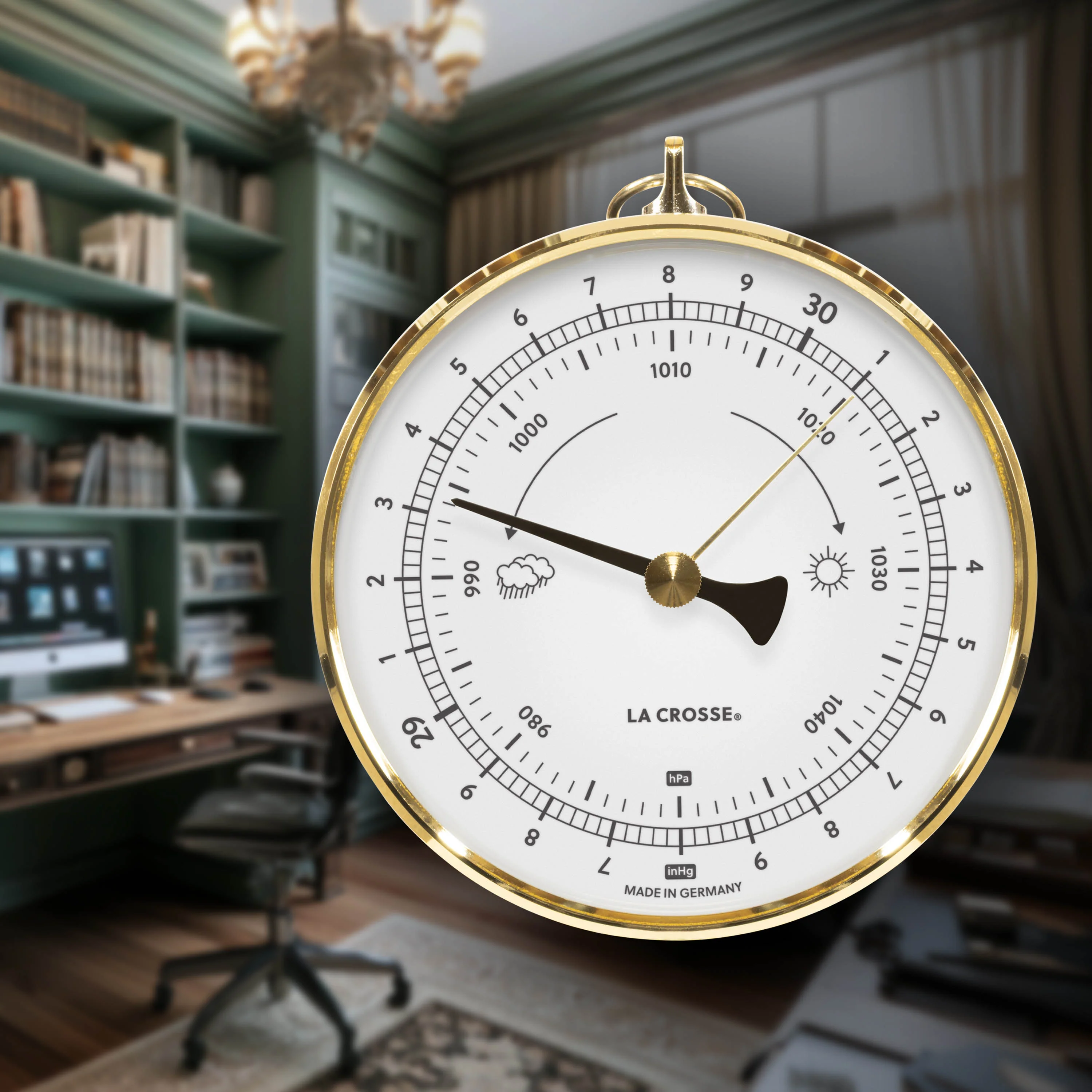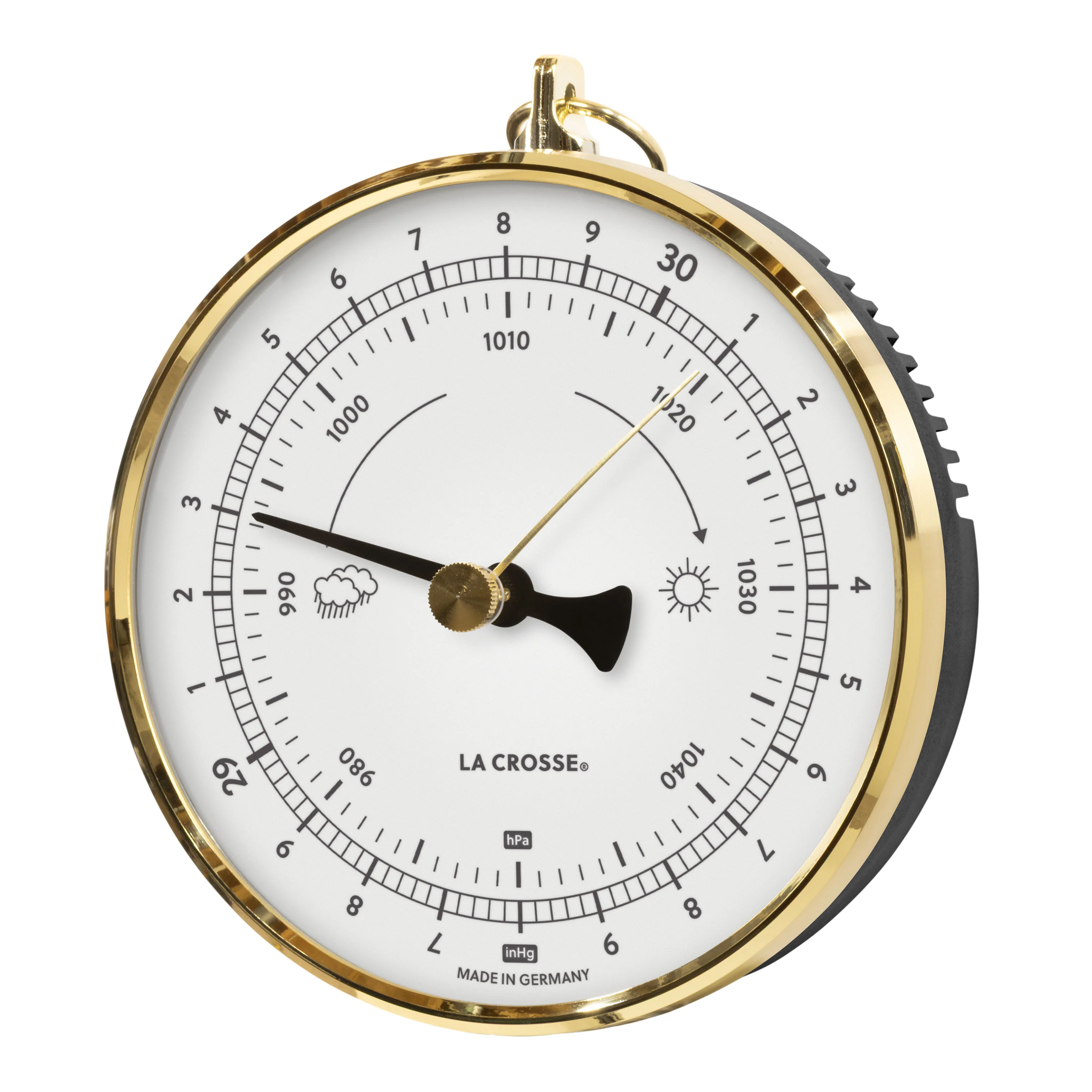 Analog weather readings that get down to brass tactics. The 138-611W Analog Dial Barometer tracks atmospheric pressure on a compact 4-inch dial with dual scales—inches of mercury and hectopascals—so you can read changing conditions before they arrive. The brass slimline frame and decorative black metal pointer give it a striking contrast against the UV-protected white dial that belongs on any wall. Durable construction and a domed protective glass lens mean it's built to hold up wherever you hang it. No batteries, no Wi-Fi, no waiting on a forecast—just brass, glass, and your own read on the weather.