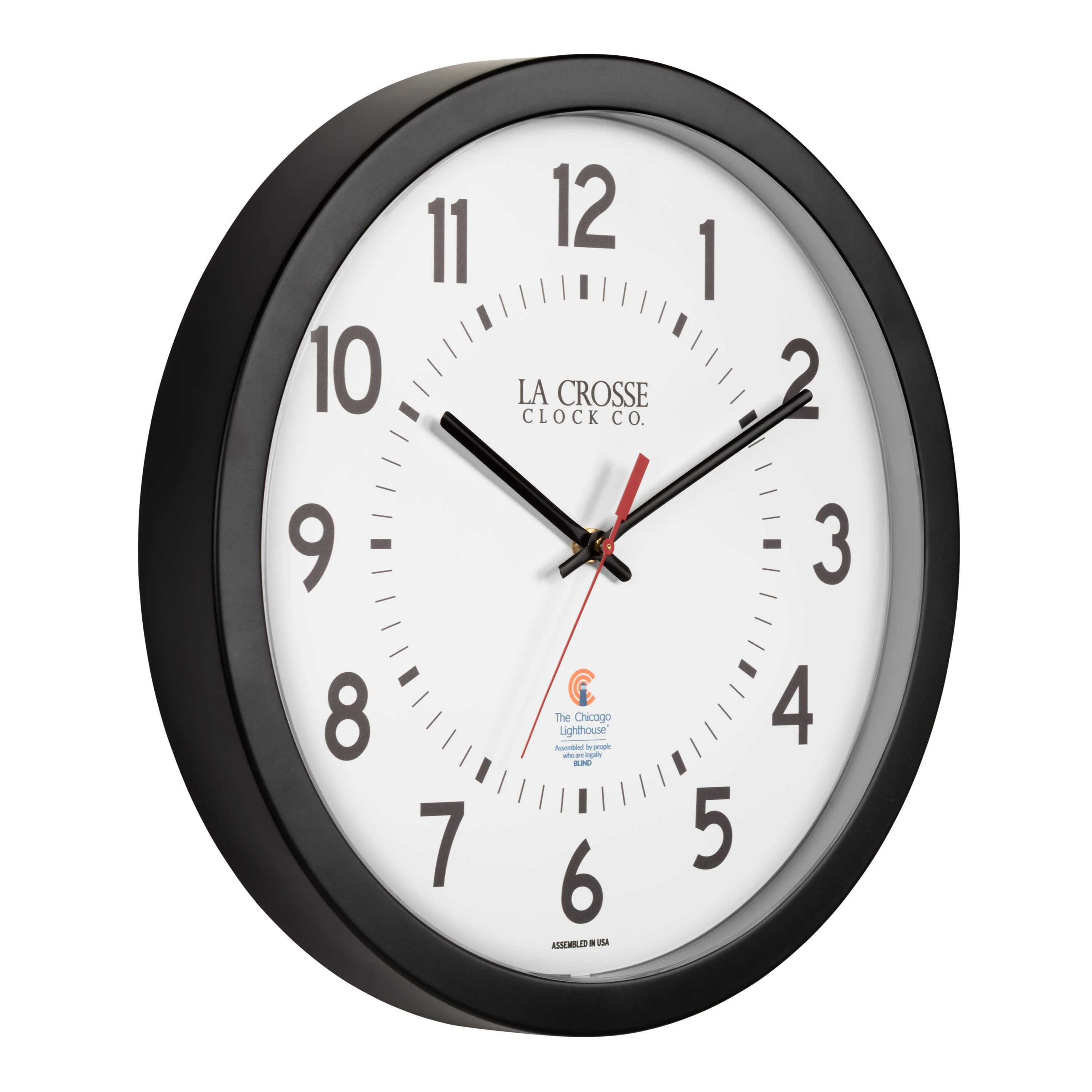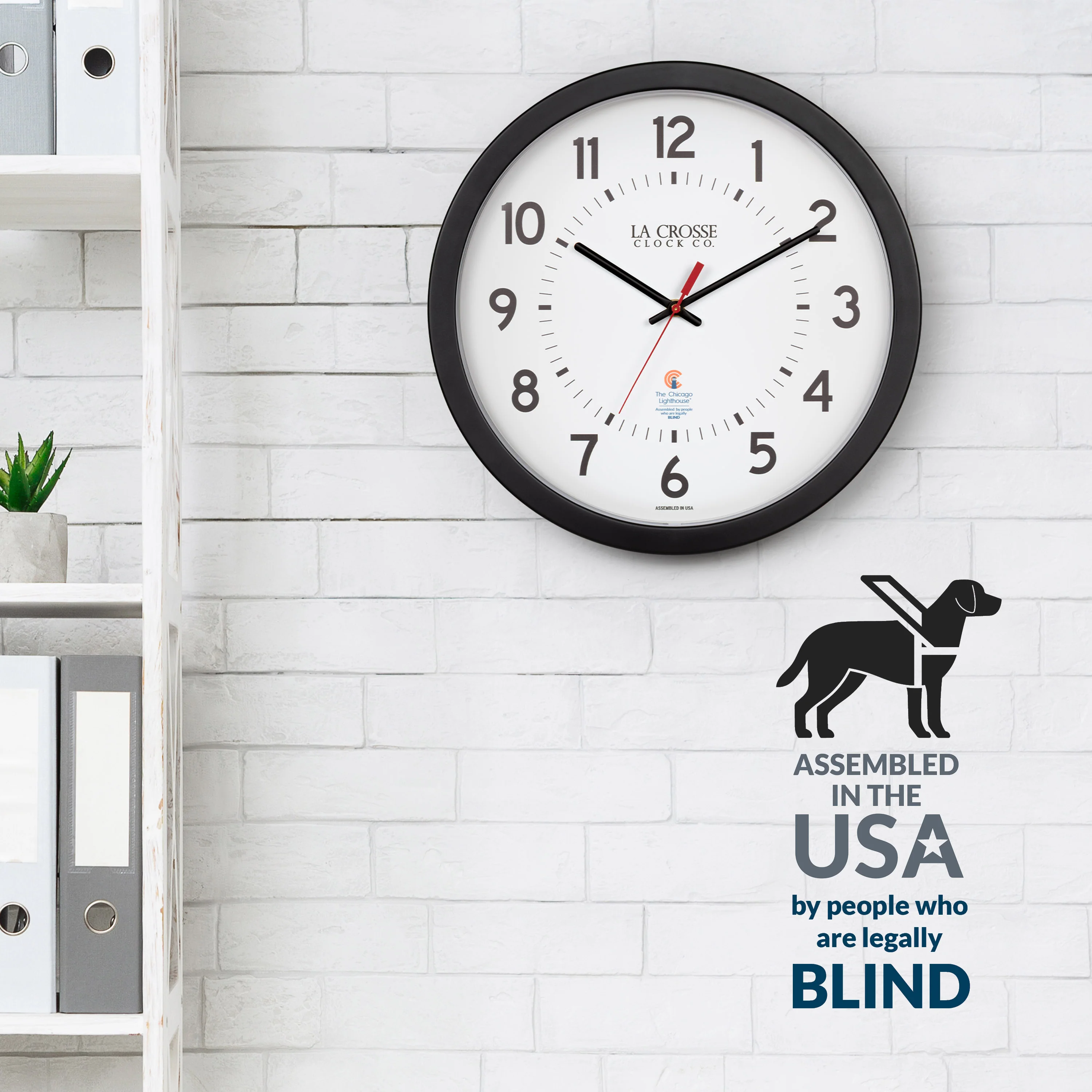 Two expert clock makers. Decades of perfecting time. This 14.5-inch flush mount wall clock brings together the expertise of two teams who know clocks inside and out—La Crosse Clock Co. and Chicago Lighthouse Industries. Designed with simplicity and legibility in mind, it features a flush-mount frame, an off-white dial, and bold black numerals, making it easy to read from across the room. Conceived and constructed in the USA, this clock reflects decades of craftsmanship and attention to detail. From offices and classrooms to kitchens and common areas, it delivers timeless style and reliable timekeeping you can count on.
